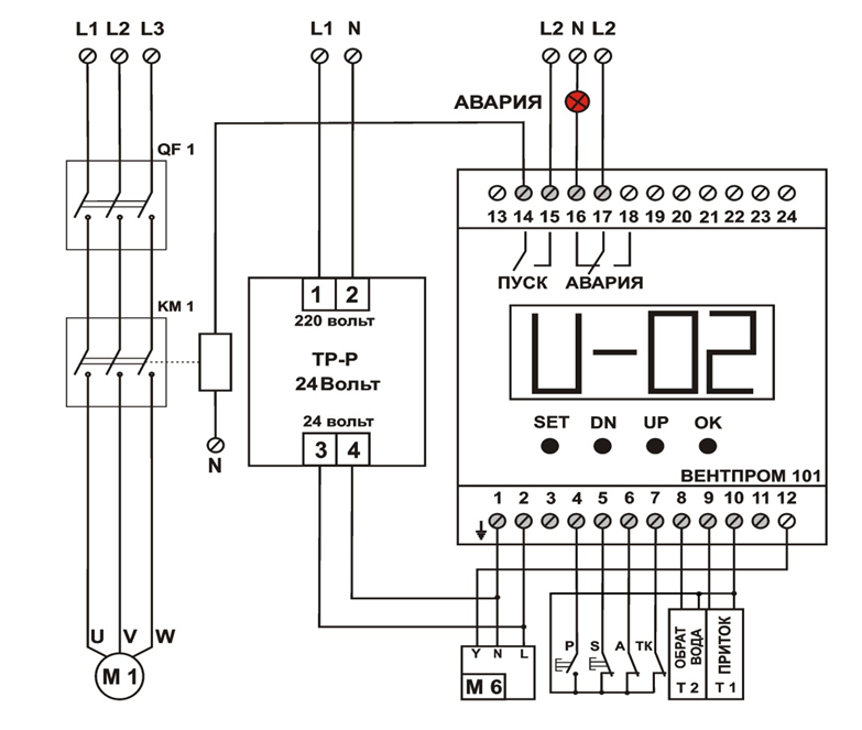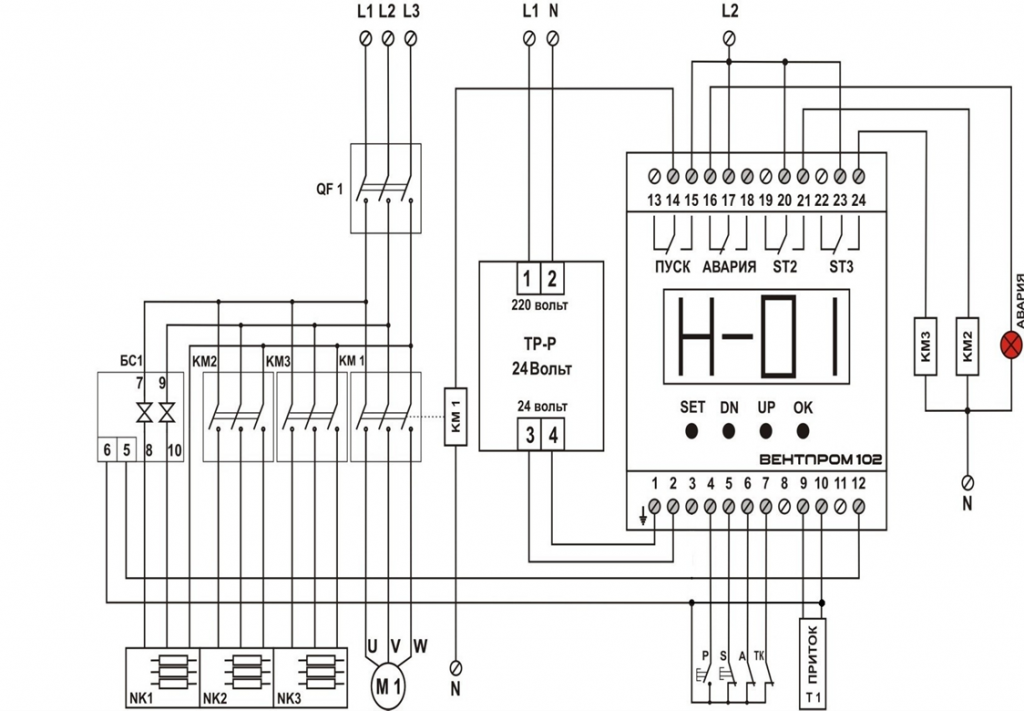 КМ1 - контактор магнитный приточного вентилятора;
