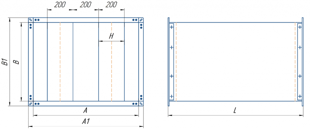 Шумоглушители ГП изготавливаются из оцинкованной стали. Конструкция пластинчатых глушителей представляет собой секцию, которая состоит из металлического кожуха длиной 500, 1000 и 1500мм с размещенными внутри него звукопоглощающими пластинами с обтекателями либо без обтекателей (обтекатели устанавливаются по желанию заказчика), а в качестве шумопоглощающего материала используется негорючая минеральная вата изолированная от воздушного потока плотным пароизоляционным материалом* – полностью исключающим попадание мельчайших частей мин.ваты в воздуховод. Шумопоглощающий и защитный слой закрепляются внутри пластин глушителя прочной оцинкованной стальной сеткой. ГП изготавливаются на фланцевом соединении. Допустимая температура перемещаемого воздуха от -40°С до +80°С.